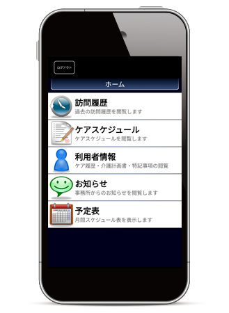 ケア項目はタップするだけで簡単にチェックできます。 ケア報告は、予測変換機能により、手書きより早く入力できます。音声入力機能も使用できます。 報告場所は、利用者宅内・利用者宅外どちらの運用にも対応できます。